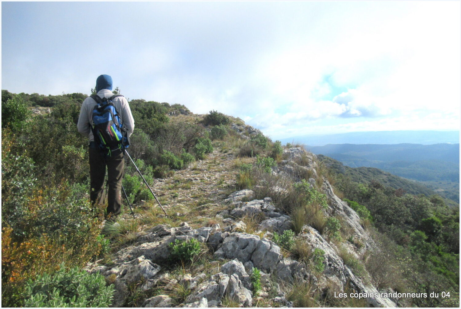 Au sommet de la Tête des Bouisses à 583 m d’altitude, sentier non balisé mais bien marqué . Le vent souffle très fort aujourd’hui