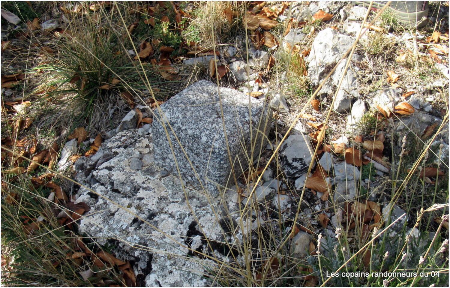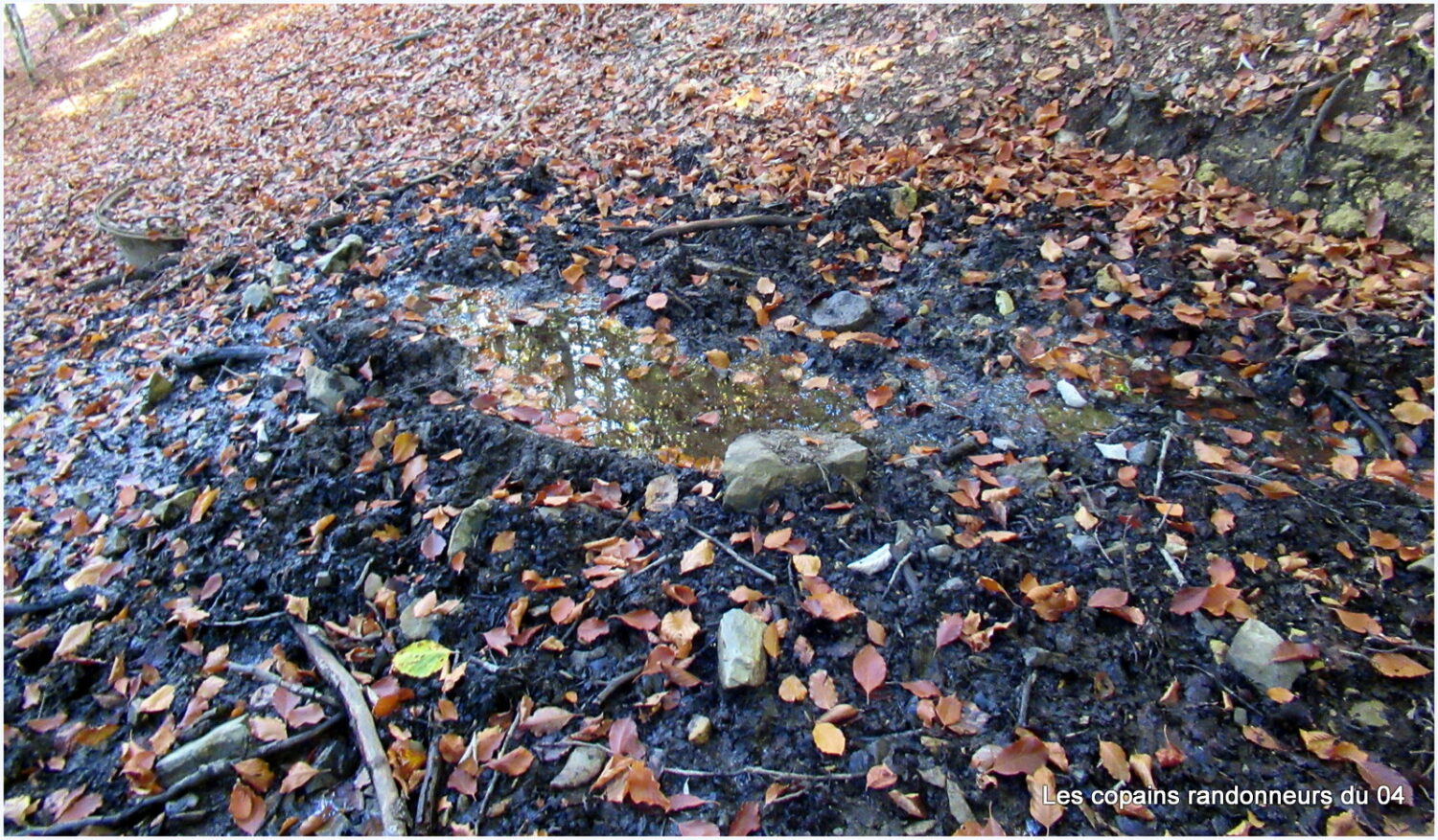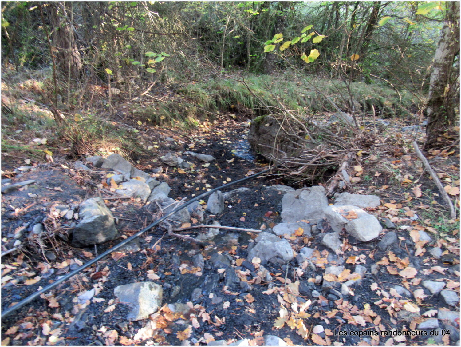 Après 500 m, quitter le sentier et emprunter à droite la petite sente qui descend vers un riou et son captage puis bifurquer à droite pour contourner la végétation sur une centaine de mètres puis virer à gauche