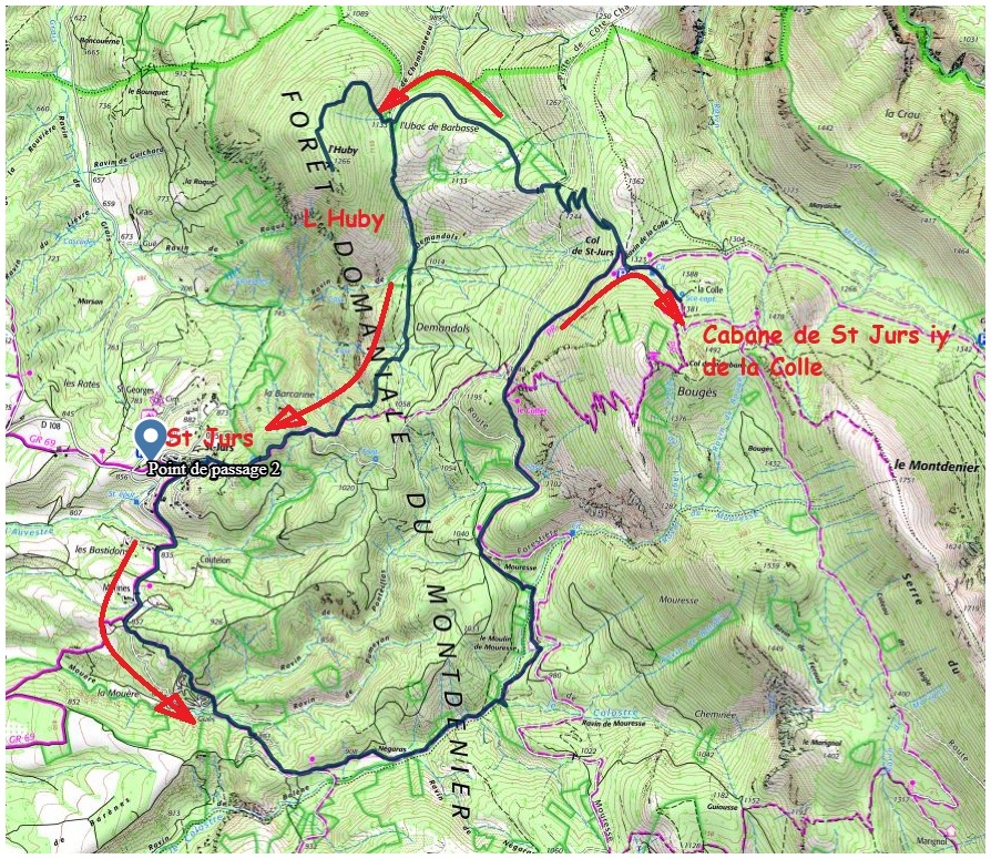 L’itinéraire monte au village, passe devant la mairie , la rue de la Forge, la rue St Joseph puis prend la direction de « Négaras » en suivant le sentier balisé puis la petite route direction Sud. Peu après la cote 857 sur IGN, il suit le sentier balisé qui monte régulièrement en foret jusqu’à atteindre le carrefour de Négaras. (ne pas suivre la large piste) Il suit ensuite la direction de « Mouresse » par un joli sentier le long du Colostre jusqu’à atteindre l’ancien Moulin de Mouresse. Le parcours se poursuit sur un sentier balisé en direction du « Collet » à 1170 m puis du Col de St Jurs à 1323 m d’altitude. Il suit la direction du ravin de La Colle puis bifurque vers « Sous le Col de la cabane » pour découvrir la cabane de La Colle à 1375 m. L’itinéraire revient au Col de St Jurs pour emprunter la piste qui part plein Nord en direction de St Jurs puis à 500 m environ, il bifurque à main gauche par une ancienne route (non balisée) qui descend en lacets jusqu’à rejoindre la piste. Ensuite il suit la piste qui part à main droite et descend vers l’Ubac de Barbasse jusqu’à la cote 1133. Après le virage en épingle, se trouve une cabane forestière, peu avant la cabane, le parcours suit un sentier à main gauche et monte vers le sommet de l’Huby. Peu avant le sommet, le sentier se rétrécit mais des cairns aident à s’orienter. Magnifique vue à 360° au sommet de l’Huby à 1266 m d’altitude. Après être redescendu à la cabane, l itinéraire se dirige plein Sud en suivant un sentier au départ +/- bien tracé puis devient roulant et caillouteux jusqu’à rejoindre la piste balisée qui ramène à St Jurs et au parking de départ.